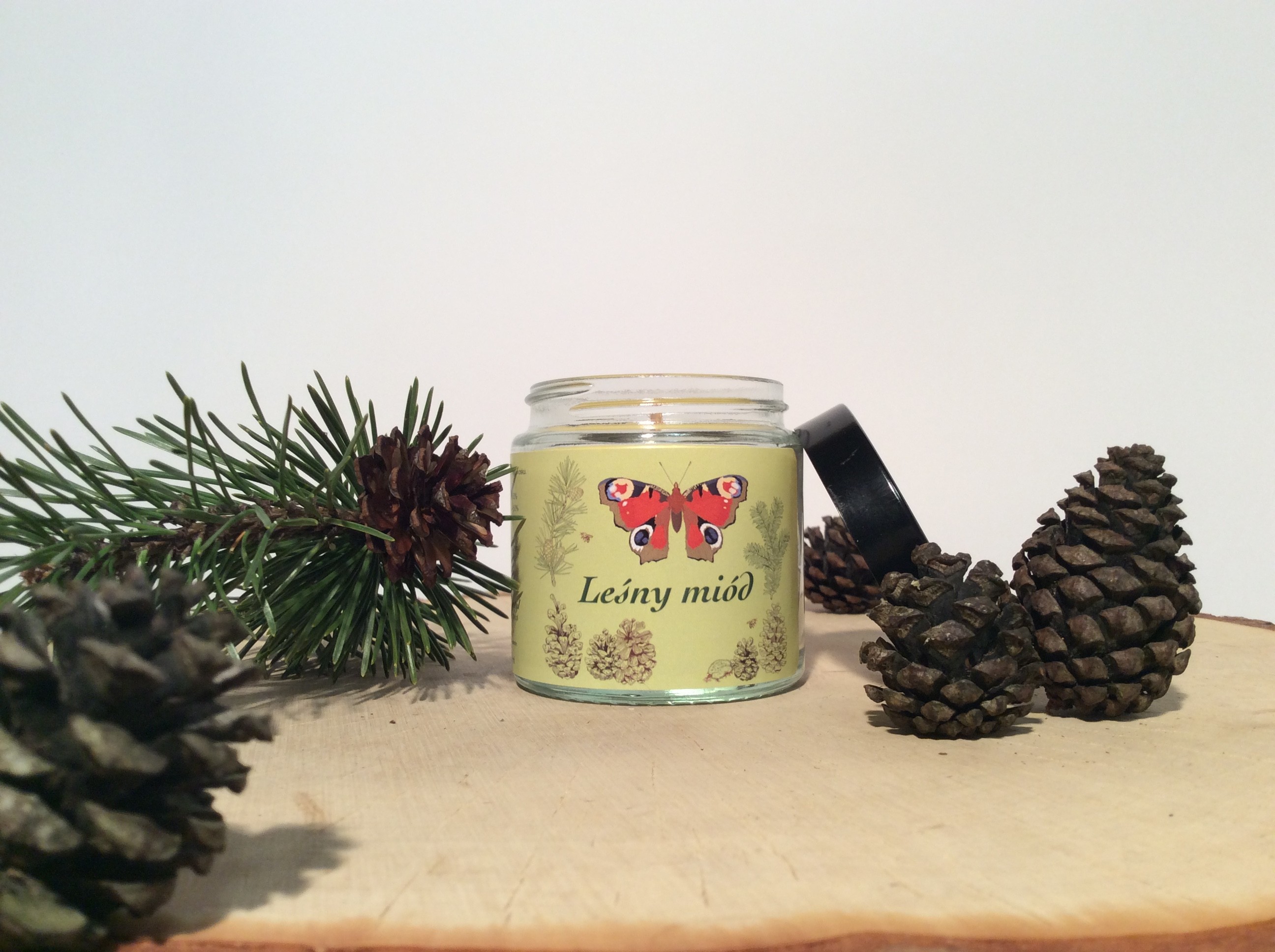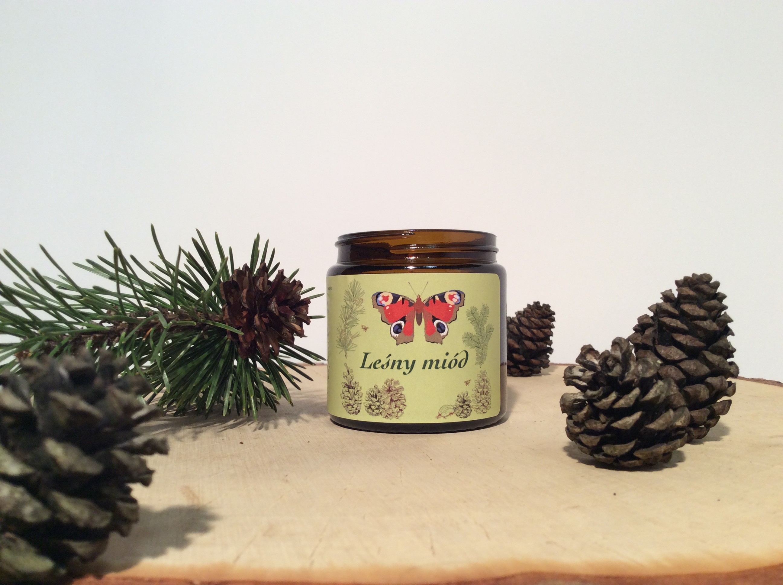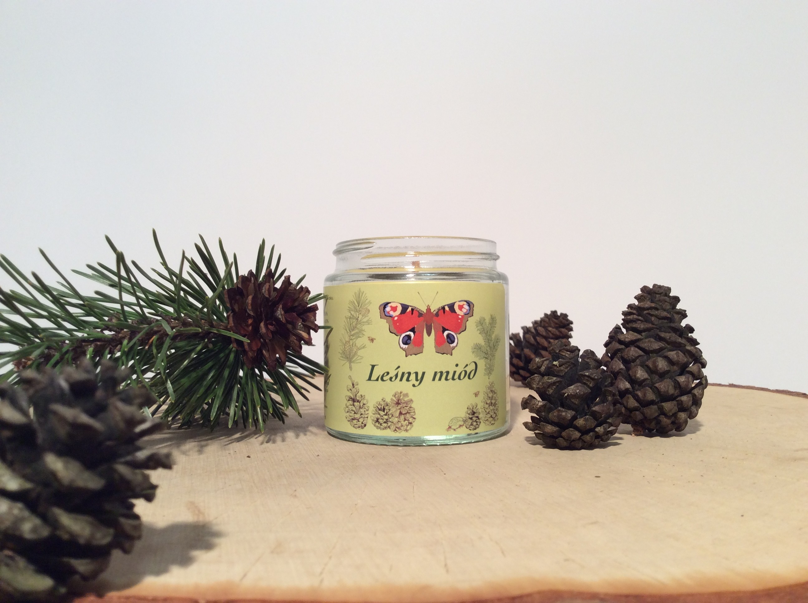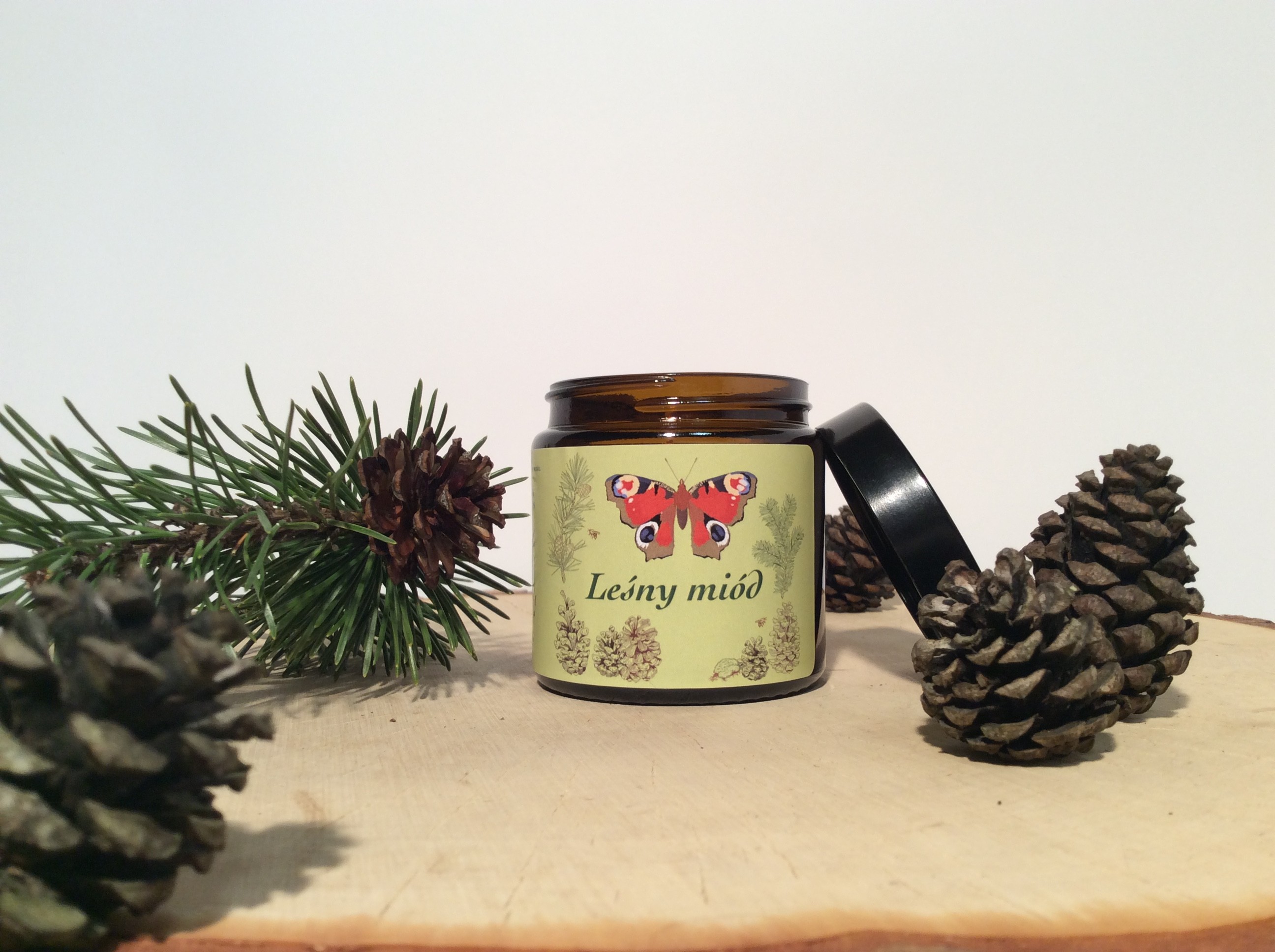 Ekologiczna świeca w słoiku o pojemności 120 ml o aromacie świerkowego lasu i miodu.