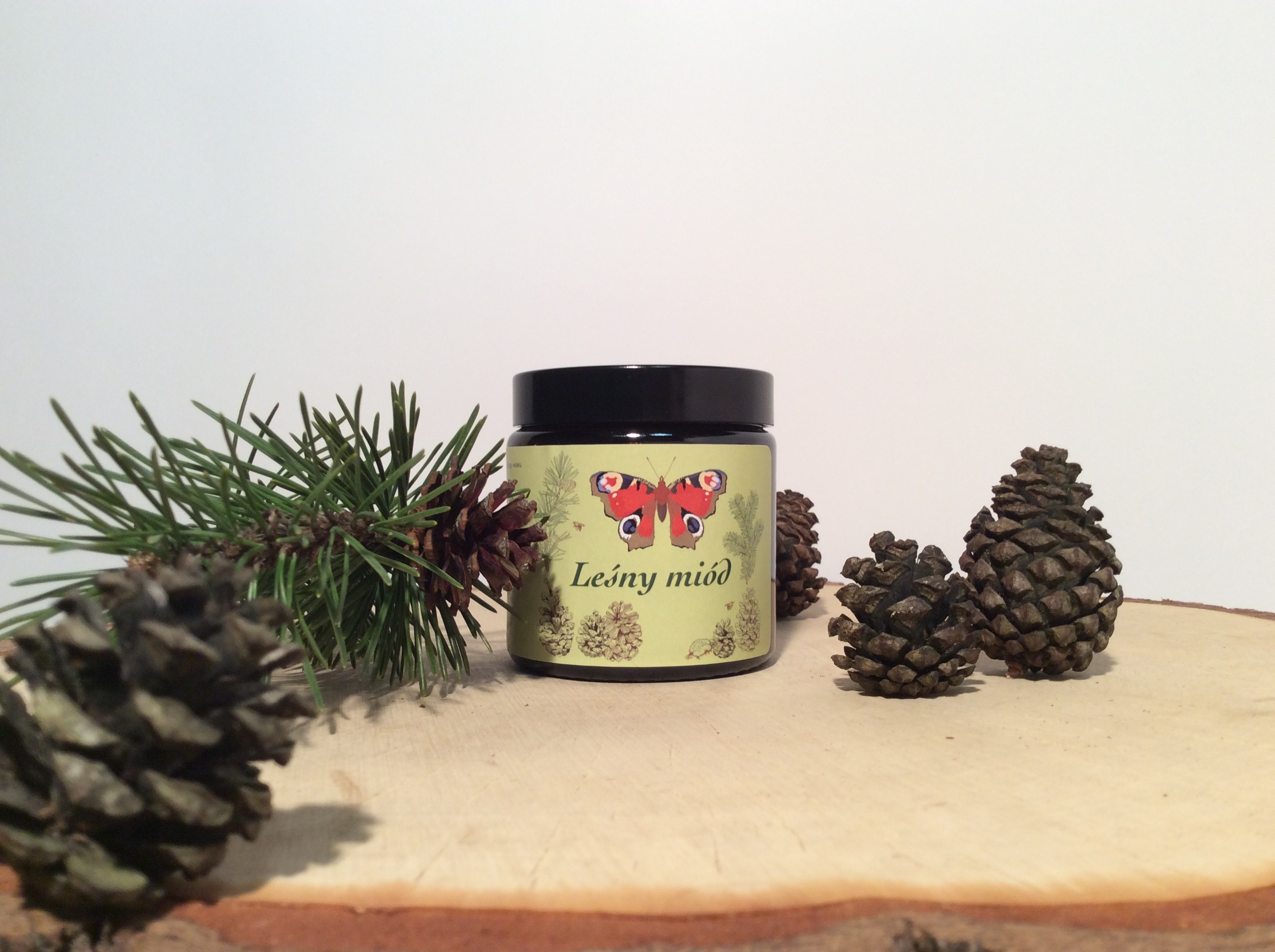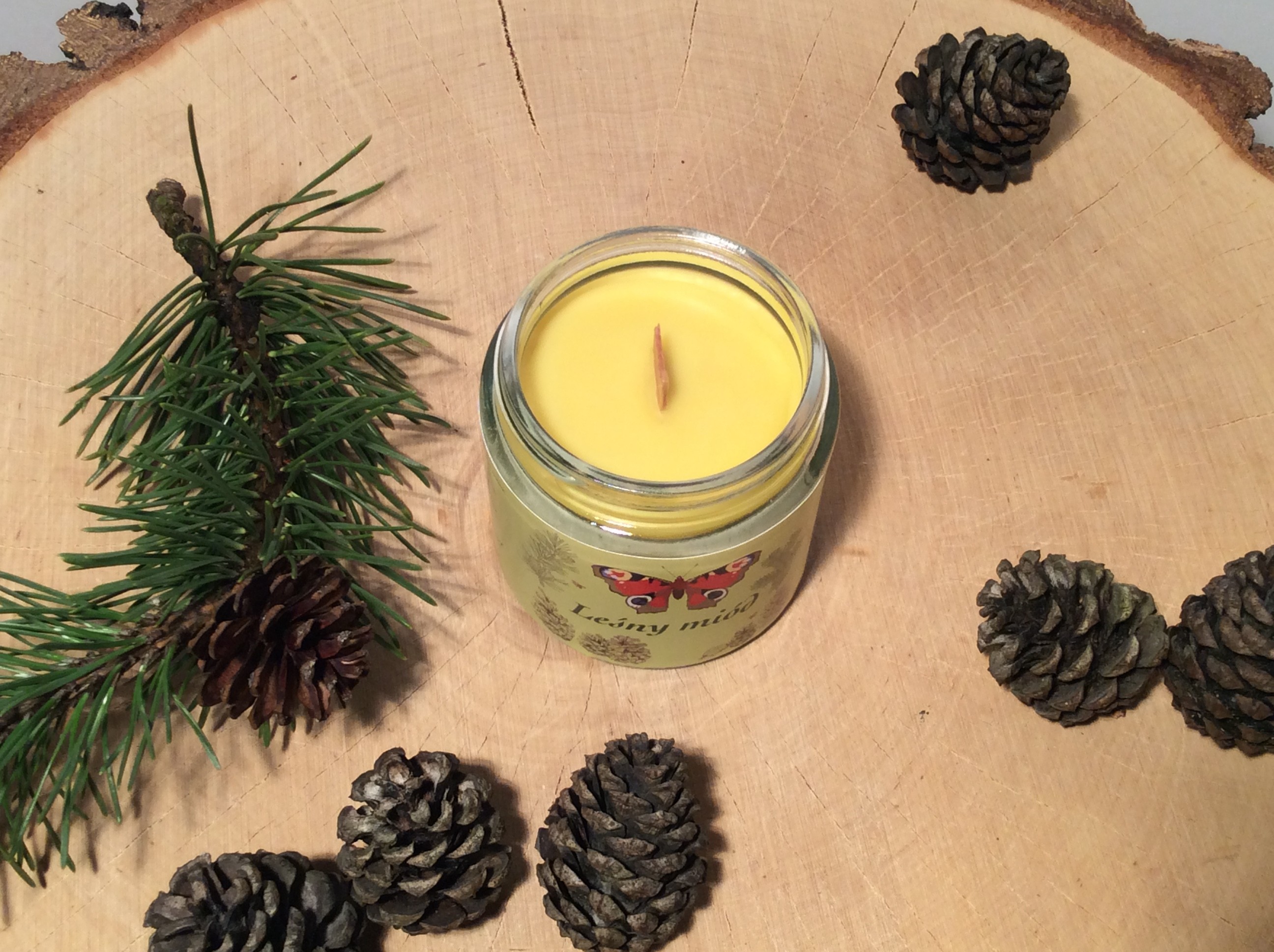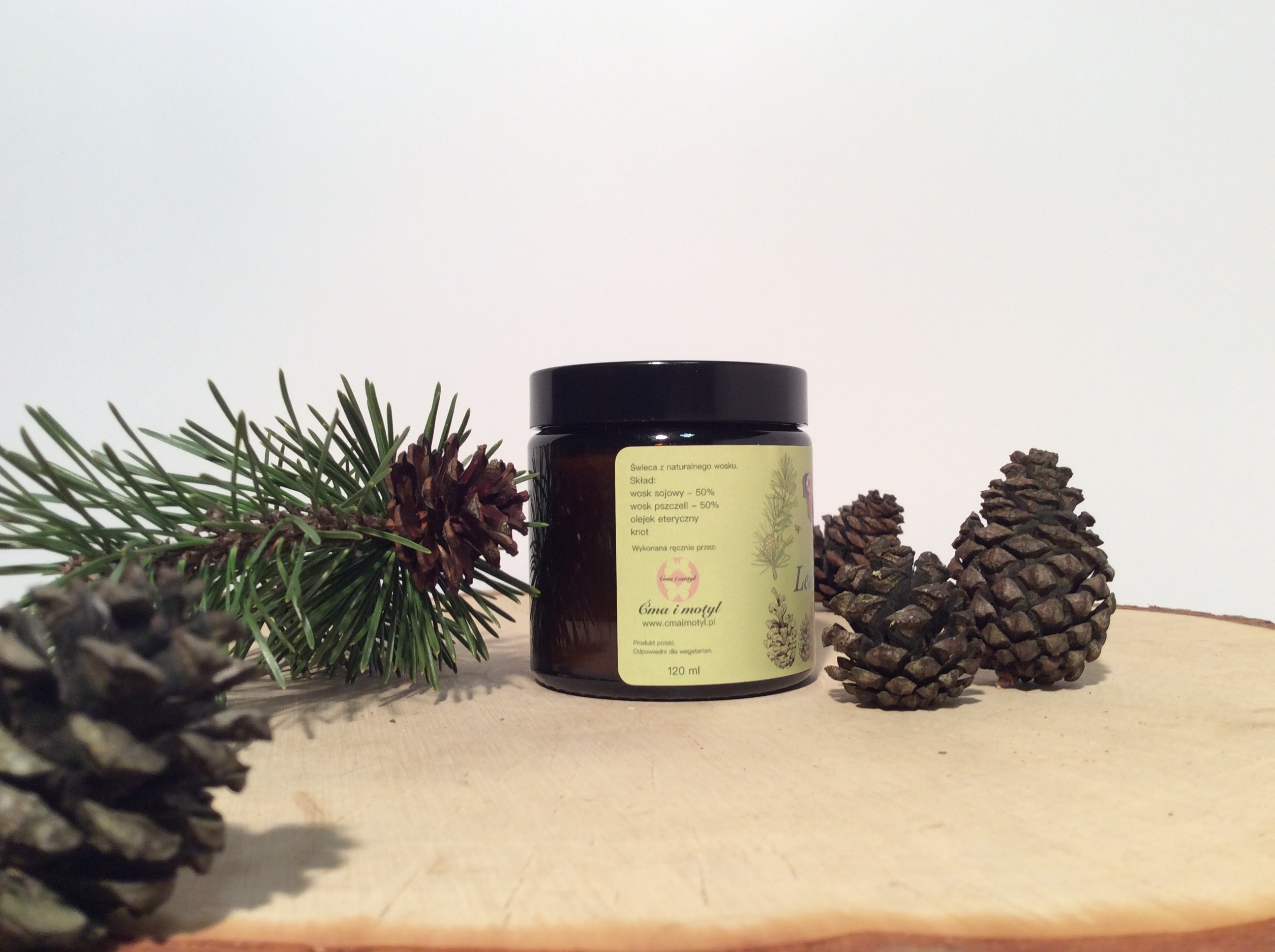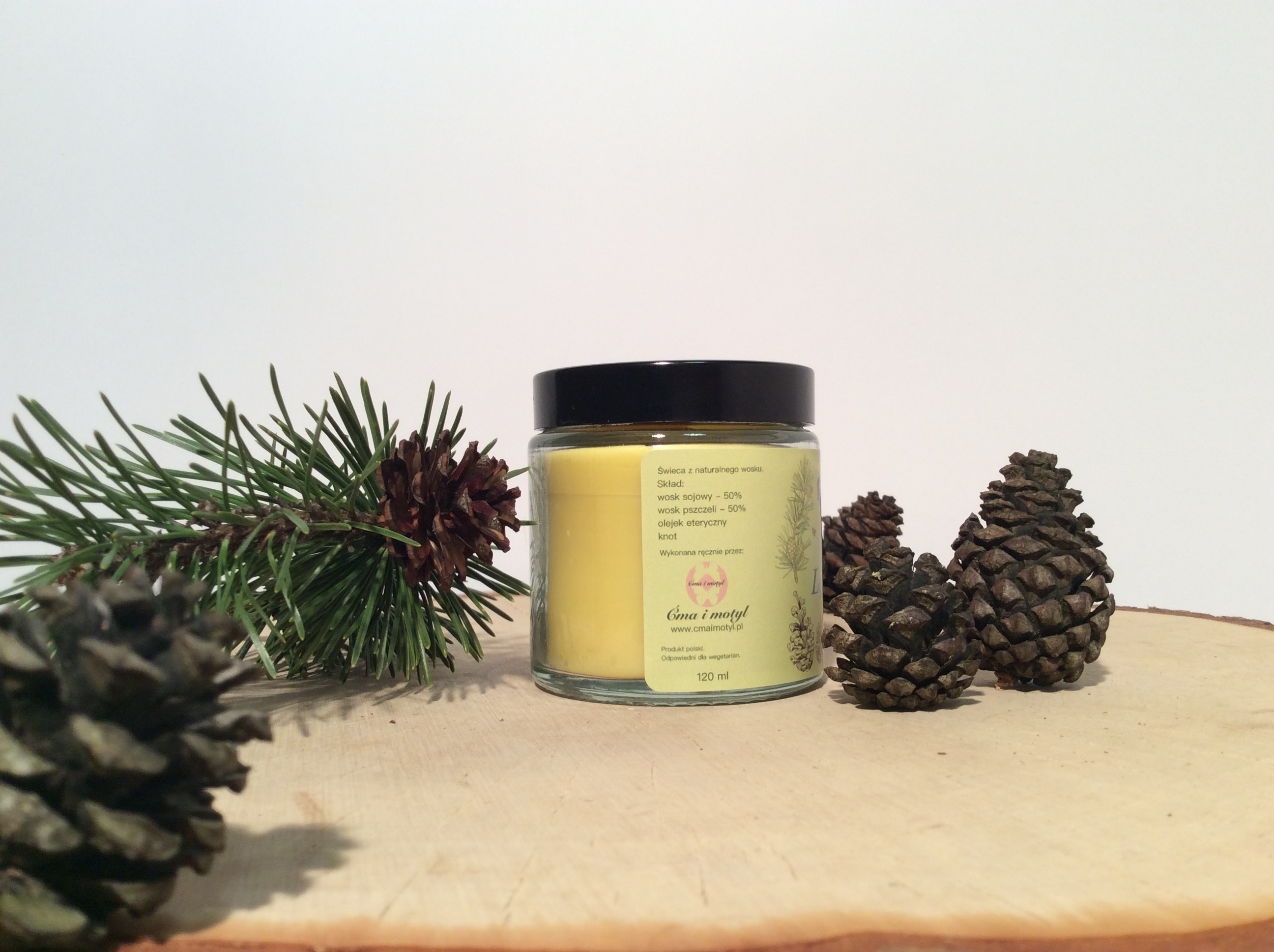 Ekologiczna świeca w słoiku o pojemności 120 ml o aromacie świerkowego lasu i miodu.